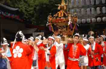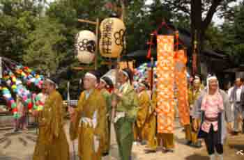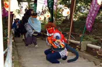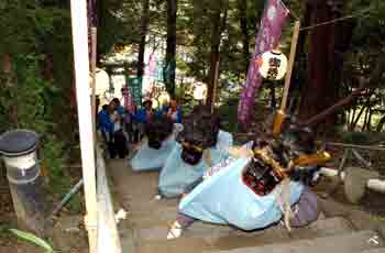 | 天狗と獅子が舞いながら石段を上って来ました。 | ||||||||||||||